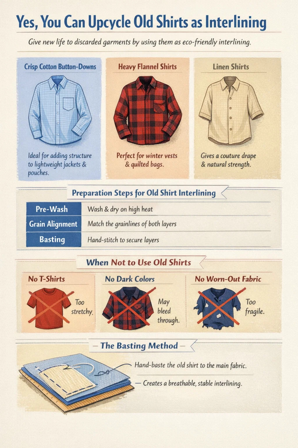 عند استخدام قميص قديم، يجب عليك "لصقه" على الجانب الخطأ من القماش الأساسي. يتضمن ذلك غرزًا طويلة ومؤقتة تحمل الربط في مكانه حتى يتم خياطة اللحامات النهائية. تسمح هذه الطريقة للطبقات بالتحرك بشكل مستقل قليلاً، مما يخلق ملابس أكثر راحة وتنفسًا مقارنة بالملمس البلاستيكي الصلب لبعض المواد اللاصقة الحديثة. باختيارك هذا النهج التقليدي، فإنك لا تقوم فقط بتوفير المال؛ أنت في كثير من الأحيان تحسين الجودة وطول العمر من العناصر اليدوية الخاصة بك.
