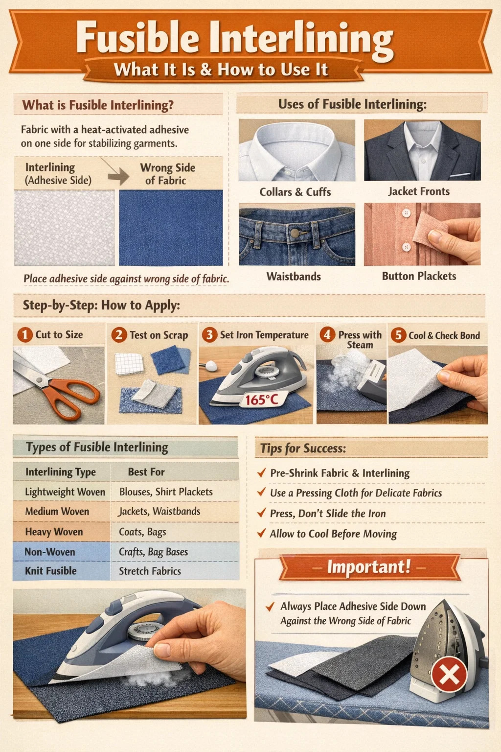 البطانة القابلة للانصهار عبارة عن مثبت للنسيج مع طبقة لاصقة منشطة بالحرارة على جانب واحد. يمكنك استخدامه عن طريق وضع الجانب اللاصق على الجانب الخاطئ من القماش، ثم استخدام مكواة ساخنة مع البخار لربط الطبقتين معًا بشكل دائم. والنتيجة هي لوحة قماش أكثر صلابة وتنظيمًا تحافظ على شكلها من خلال التآكل والغسيل. تستغرق هذه العملية أقل من دقيقتين لكل لوحة وهي الطريقة الأكثر موثوقية لإضافة الجسم إلى الياقات، والأصفاد، وأحزمة الخصر، والفتحات، وواجهات السترات دون خياطة يدوية أو خياطة طبقة إضافية.