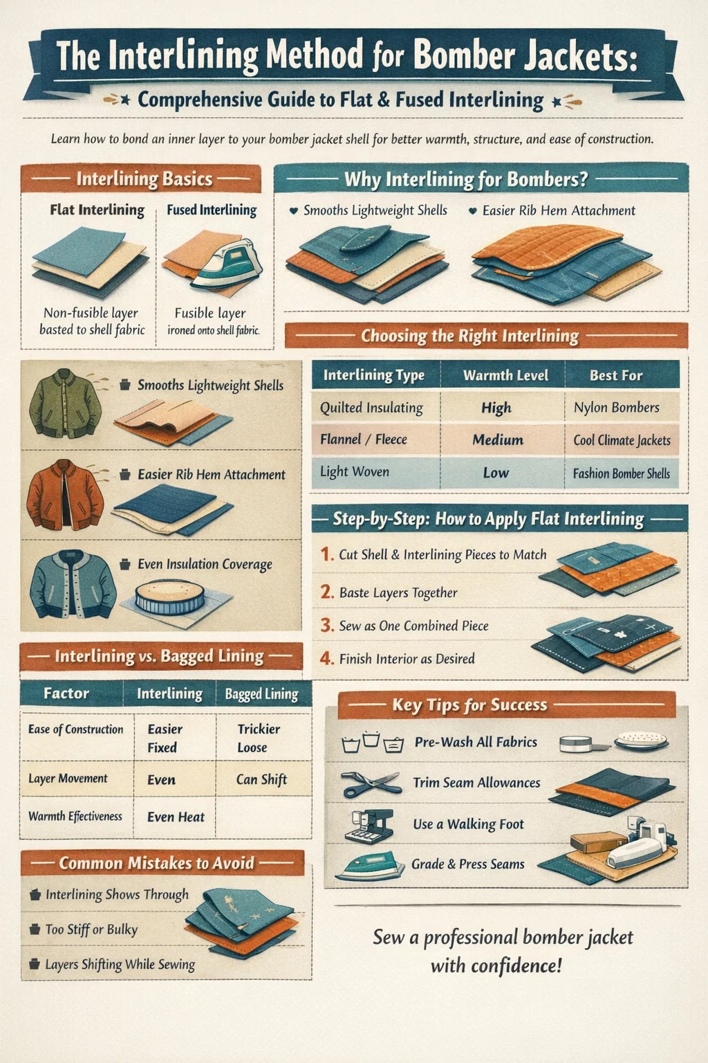 أيًا كانت مادة التبطين التي تختارها، فإن طريقة التبطين المسطح تحول عملية بناء سترة البومبر من تحدي دقيق في إدخال البطانة إلى بناء منهجي طبقة تلو طبقة - وهذا ترقية ذات مغزى لأي شخص كان يتصارع مع تعبئة البطانة في سترة ذات حاشية مضلعة من قبل.