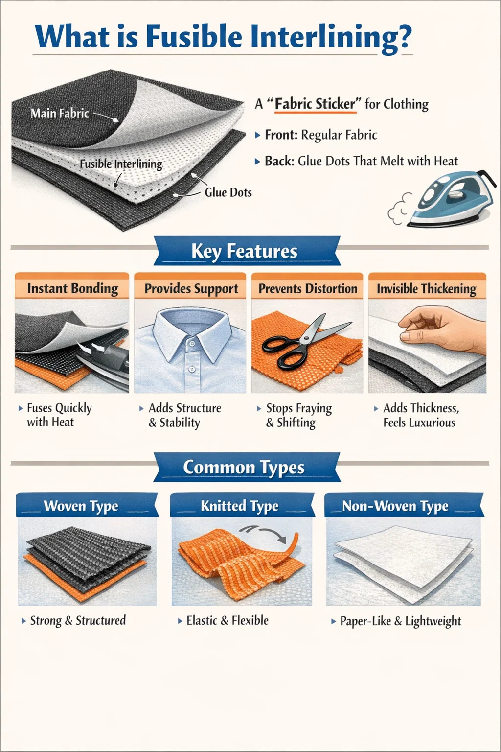 الترابط الفوري: هذه هي أكبر ميزة له. يمكنك ببساطة وضعه على الجزء الخلفي من القماش الرئيسي وكيه بمكواة أو بالضغط الحراري. تعمل الحرارة على إذابة نقاط الصمغ الموجودة على الظهر، مما يتسبب في التصاق القماش المبطن ببعضه البعض بإحكام.