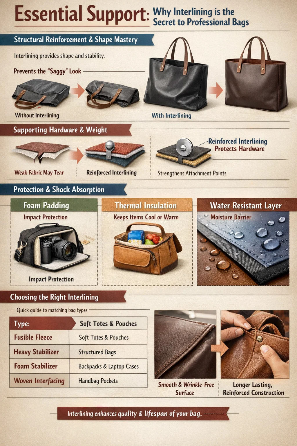 السبب الرئيسي لاستخدام الربط في بناء الحقيبة هو توفير السلامة الهيكلية والاحتفاظ بالشكل على المدى الطويل هذا النسيج وحده لا يستطيع تحقيقه. بدون هذه الطبقة المخفية، ستنهار معظم الحقائب تحت ثقلها أو وزن العناصر الموجودة بداخلها، فتبدو ضعيفة ومتجعدة وغير مكتملة. بإضافة الصحيح الربط ، يمكنك تحويل قطعة قماش بسيطة إلى كائن ثلاثي الأبعاد وظيفي يقف في وضع مستقيم ويحمي محتوياته ويتحمل قسوة الاستخدام اليومي.